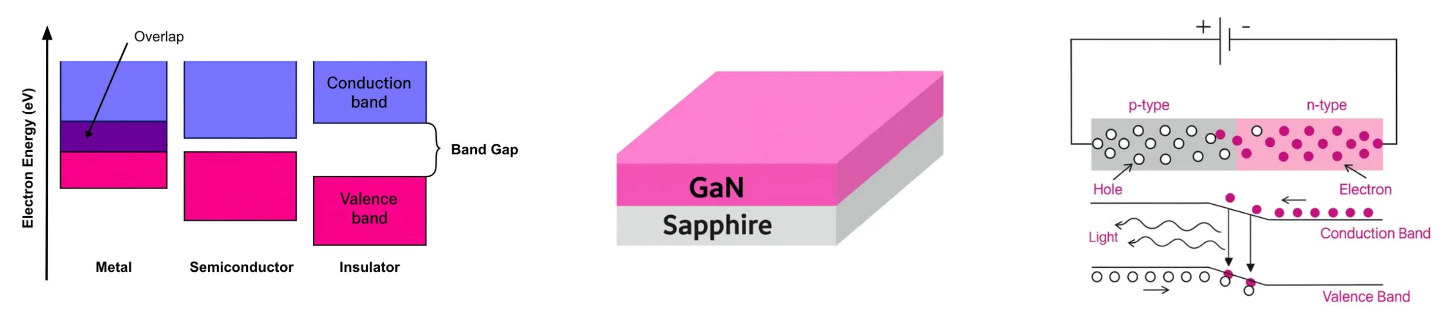 The problem, much like with Far-UVC today, was the material itself. The semiconductor needed for blue light required an exceptionally wide band gap, but this very property is what makes a material so difficult to work with. The tightly bonded electrons that create a wide band gap are also what make it incredibly hard to grow the material into a perfect, defect-free crystal that can then be reliably doped.