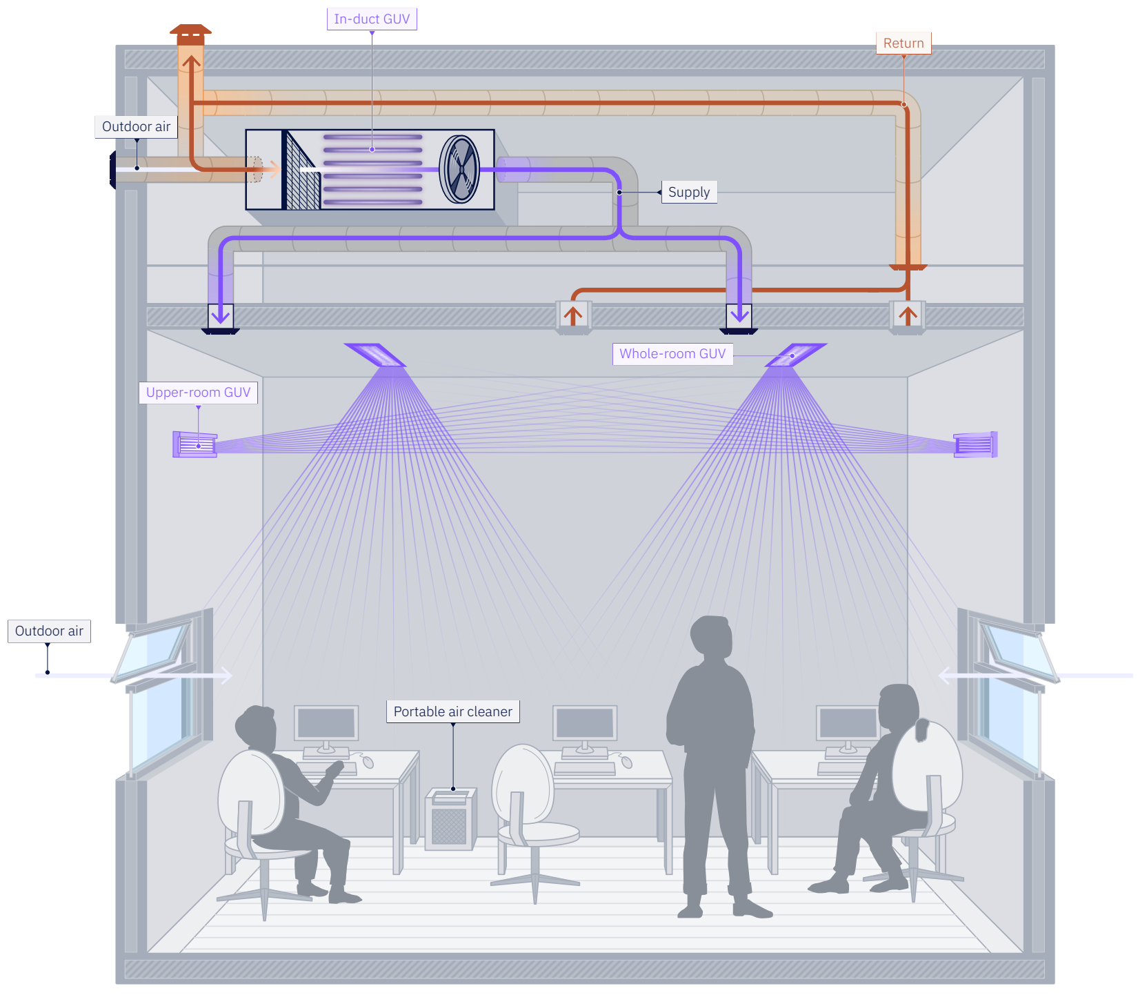 Right now, we mainly try to clean indoor air with either UV lights pointed at the ceiling or with big HEPA filter units. Both of these have major drawbacks, they only clean the air far away from people and rely on sufficient air circulation to do their job. On top of that, they can be very expensive to install and maintain.