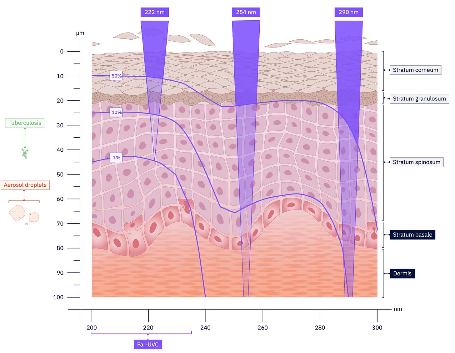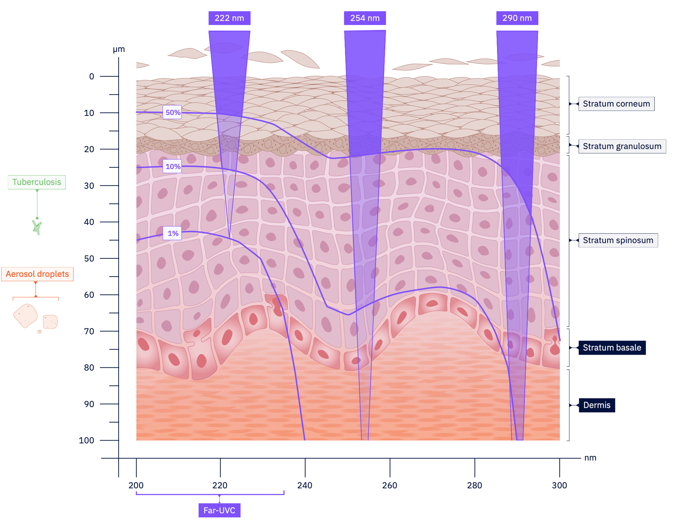 Far-UVC light, in contrast, has a much shorter wavelength. This shorter wavelength means it is strongly absorbed by biological materials, meaning its penetration is limited to the non-living outer layer of the skin and the very top of the eye’s surface. While safety studies are ongoing [1][2][3], this is why far-UVC is widely regarded as safe for use in the presence of people.